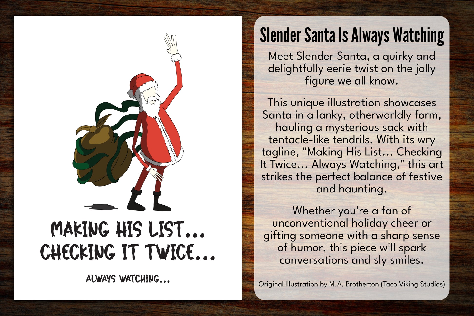 Meet Slender Santa, a quirky and delightfully eerie twist on the jolly figure we all know. This unique illustration showcases Santa in a lanky, otherworldly form, hauling a mysterious sack with tentacle-like tendrils. With its wry tagline, "Making His List... Checking It Twice... Always Watching," this art strikes the perfect balance of festive and haunting. Whether you're a fan of unconventional holiday cheer or gifting someone with a sharp sense of humor, this piece will spark conversations and sly smiles.