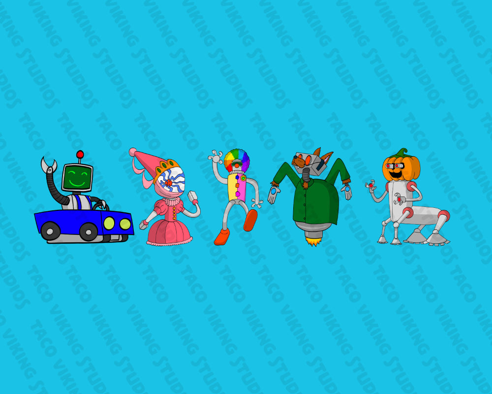 This vibrant illustration features five unique robots decked out in their festive best, each costume a delightful blend of mechanical marvel and spooky charm. Perfect for those who love a twist on the traditional, this design brings a playful energy to your Halloween projects.