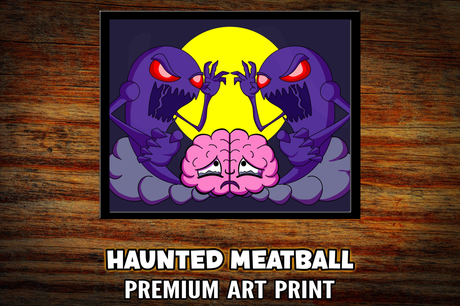 Dive into the depth of the psyche with the "Haunted Meatball" art print, a powerful representation of the struggles and triumphs of mental health. This thought-provoking piece showcases a brain caught between two ghostly entities against a stark moon, symbolizing the inner conflict and resilience in the face of adversity.