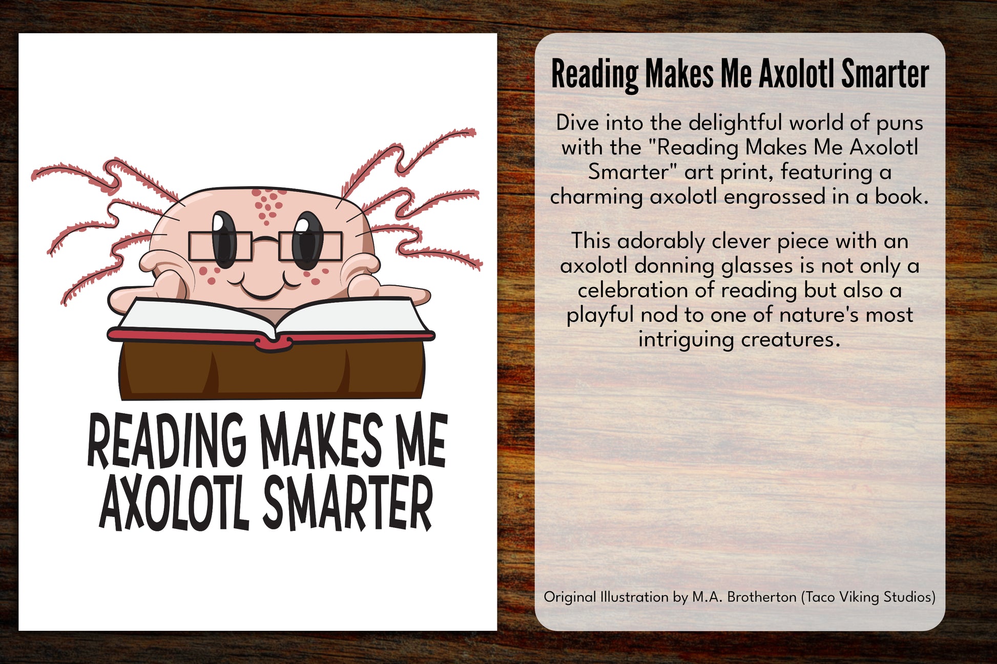 Dive into the delightful world of puns with the "Reading Makes Me Axolotl Smarter" art print, featuring a charming axolotl engrossed in a book.