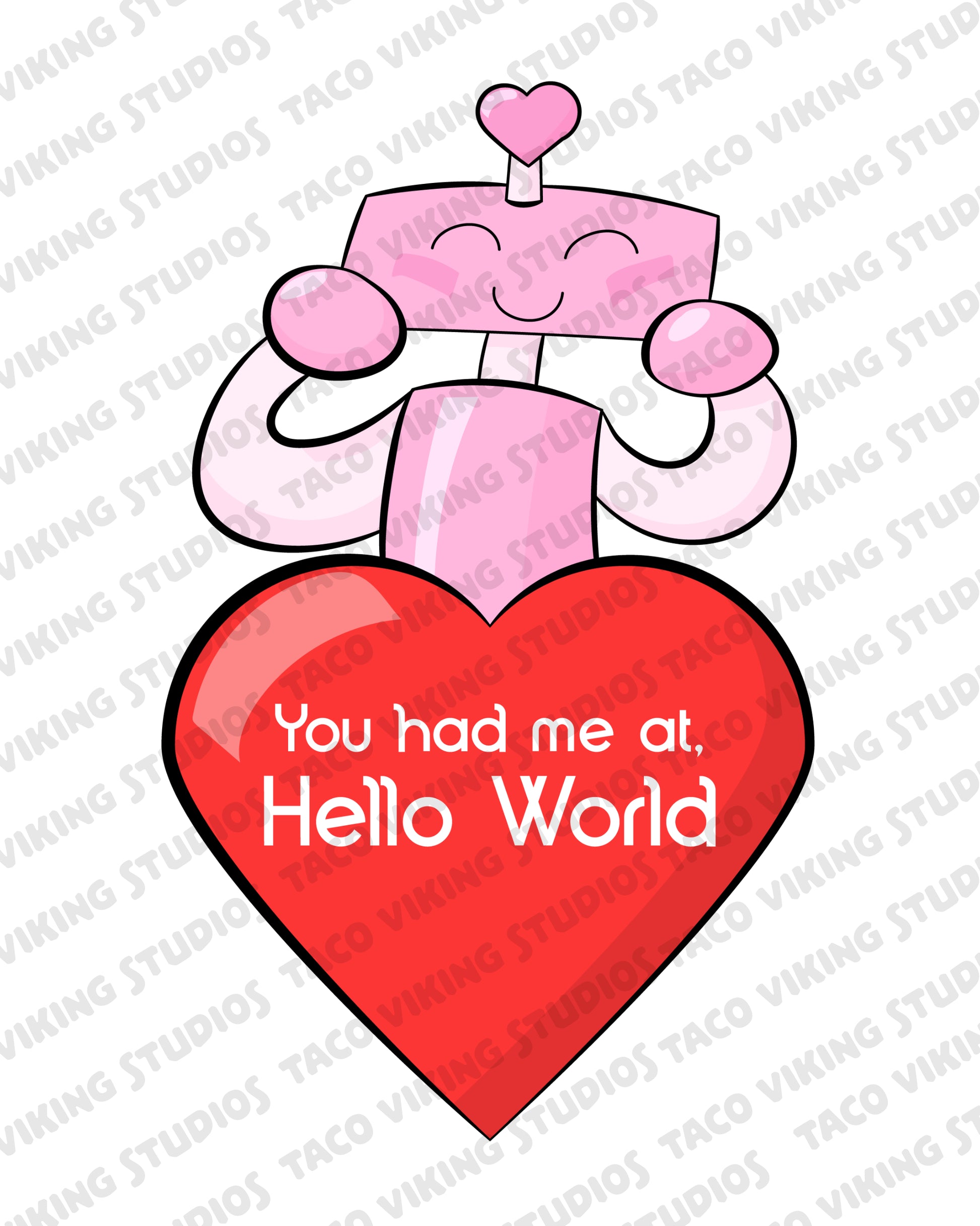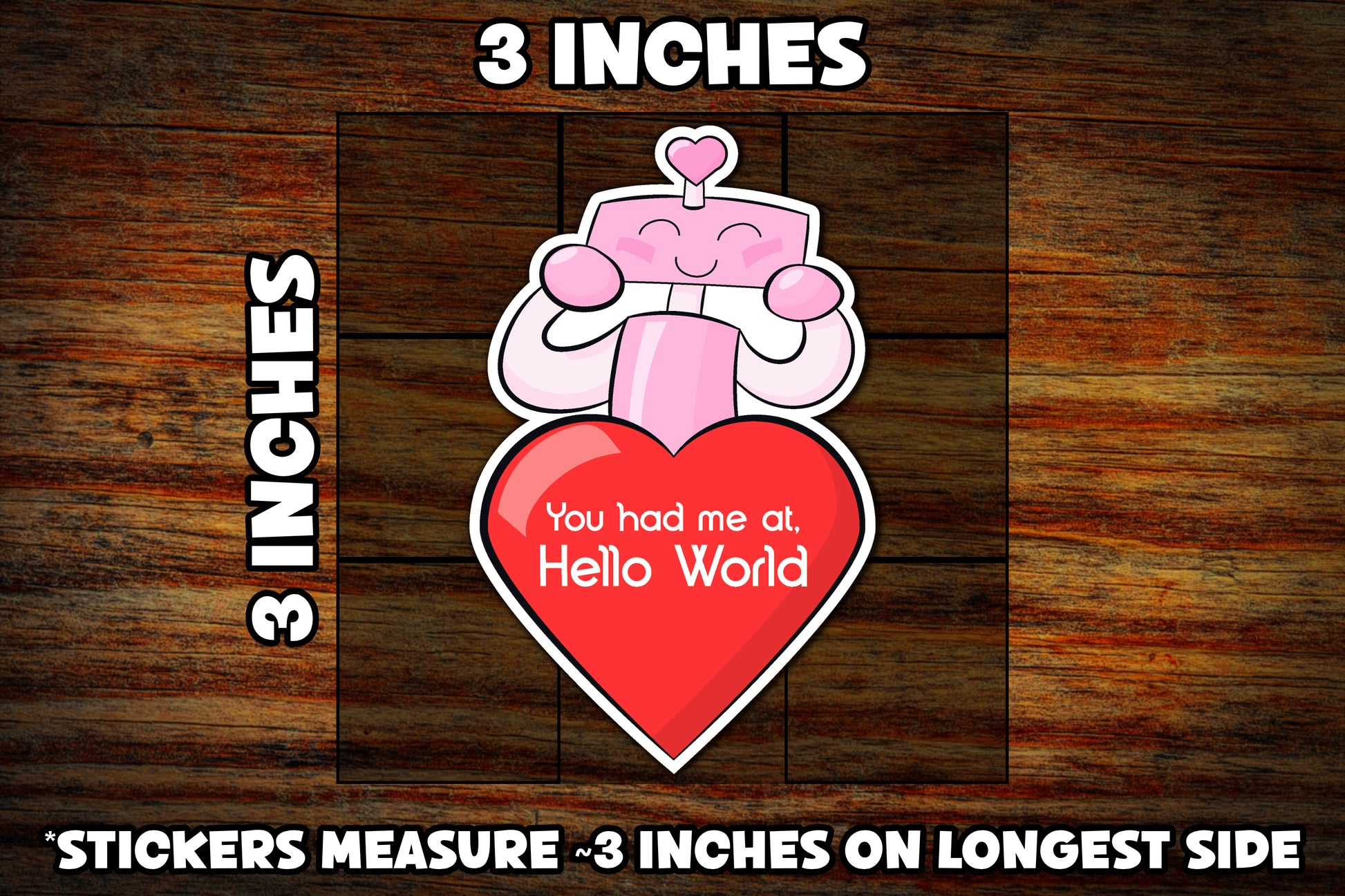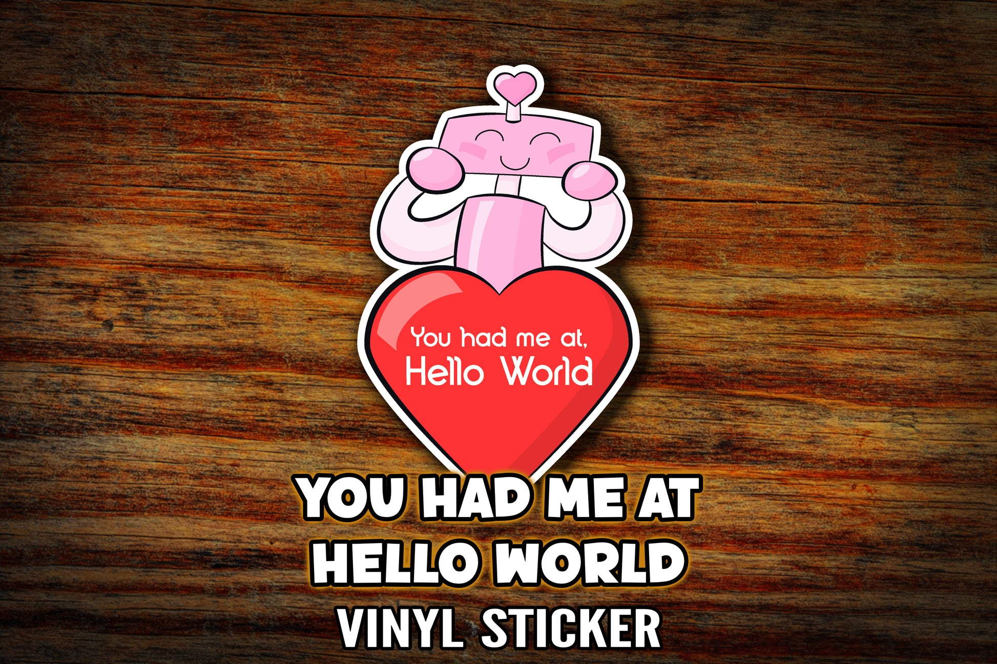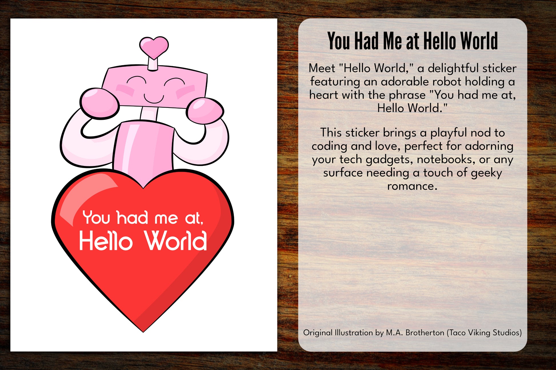 Meet "Hello World," a delightful sticker featuring an adorable robot holding a heart with the phrase "You had me at, Hello World."